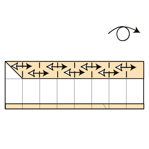 Reinforce all the vertical creases in the top colored section. Then turn the model over.