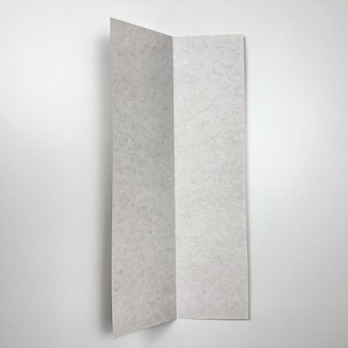 Start with the white side of the paper facing up. Fold it in half vertically, then unfold.
