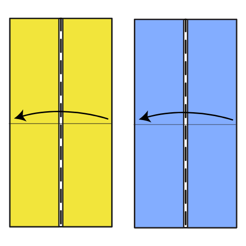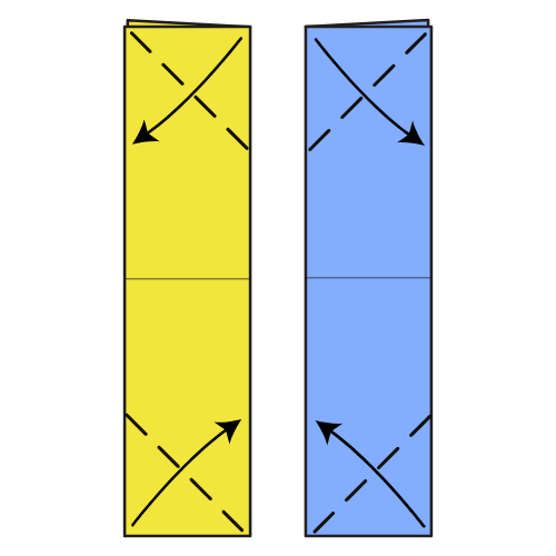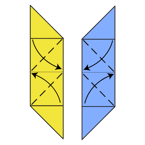 Second unit: Repeat the same folds but mirrored. Fold the top corner to the left and the bottom corner to the right.