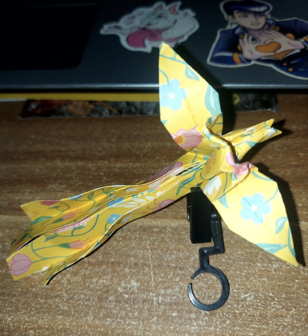 Itโs definitely a tricky one to capture in photos (and even to display) but such a beautiful model. I was happy with the picture I used for the featured image, though I also thought about displaying it on an origami box or cube since the angle underneath the phoenix matches nicely. It won’t balance too well on its own, so a little glue or even a sewing pin can help keep it steady.
