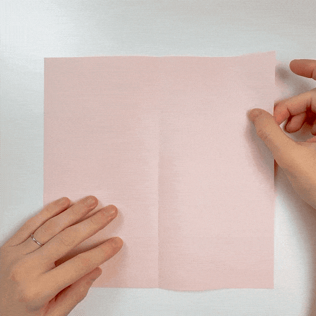 Start with the colored side of the paper facing up. Fold the paper in half vertically, then unfold.