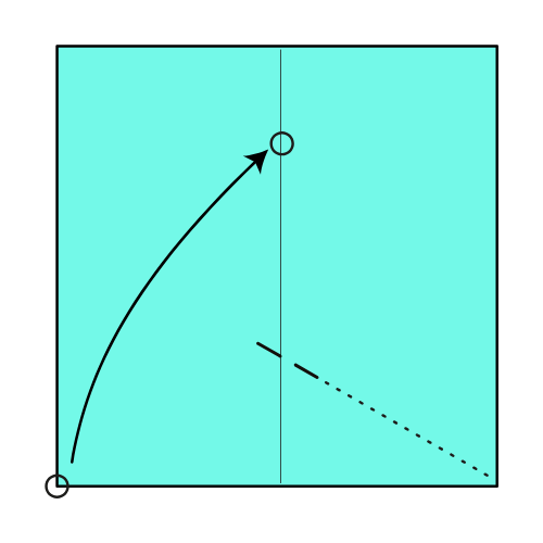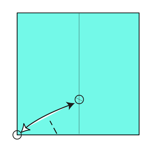 Fold the bottom left corner to the circled point. Start the fold from the bottom right corner. Only crease at the vertical centerline to make a pinch mark.